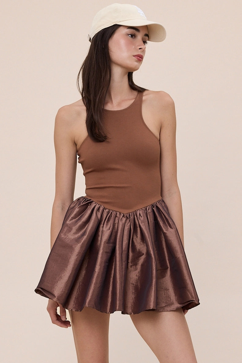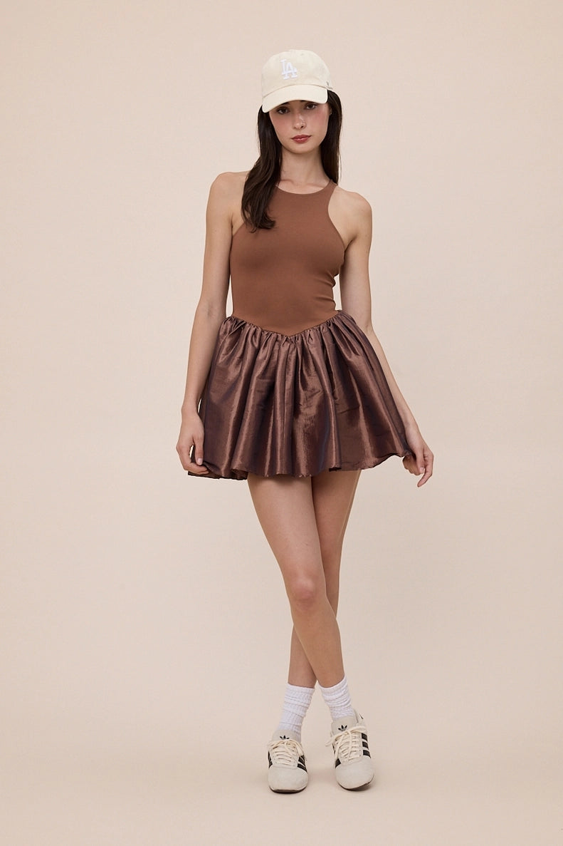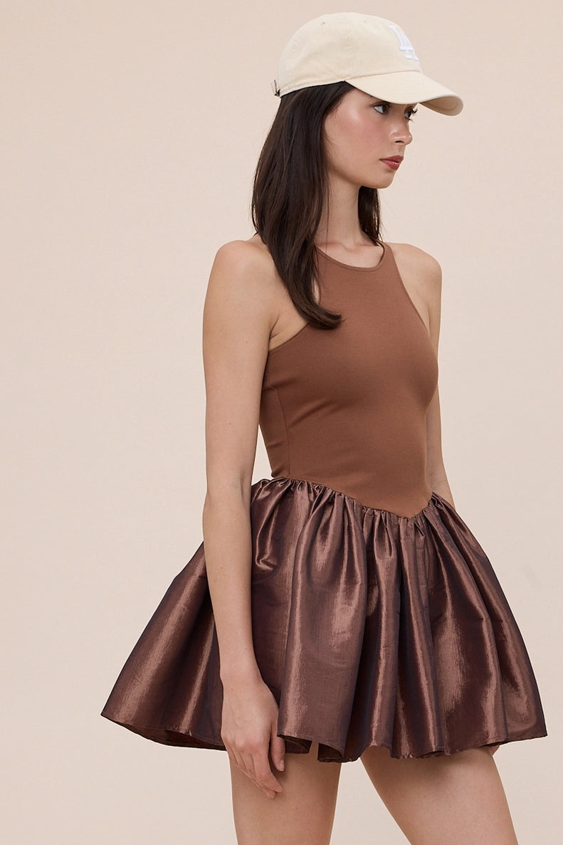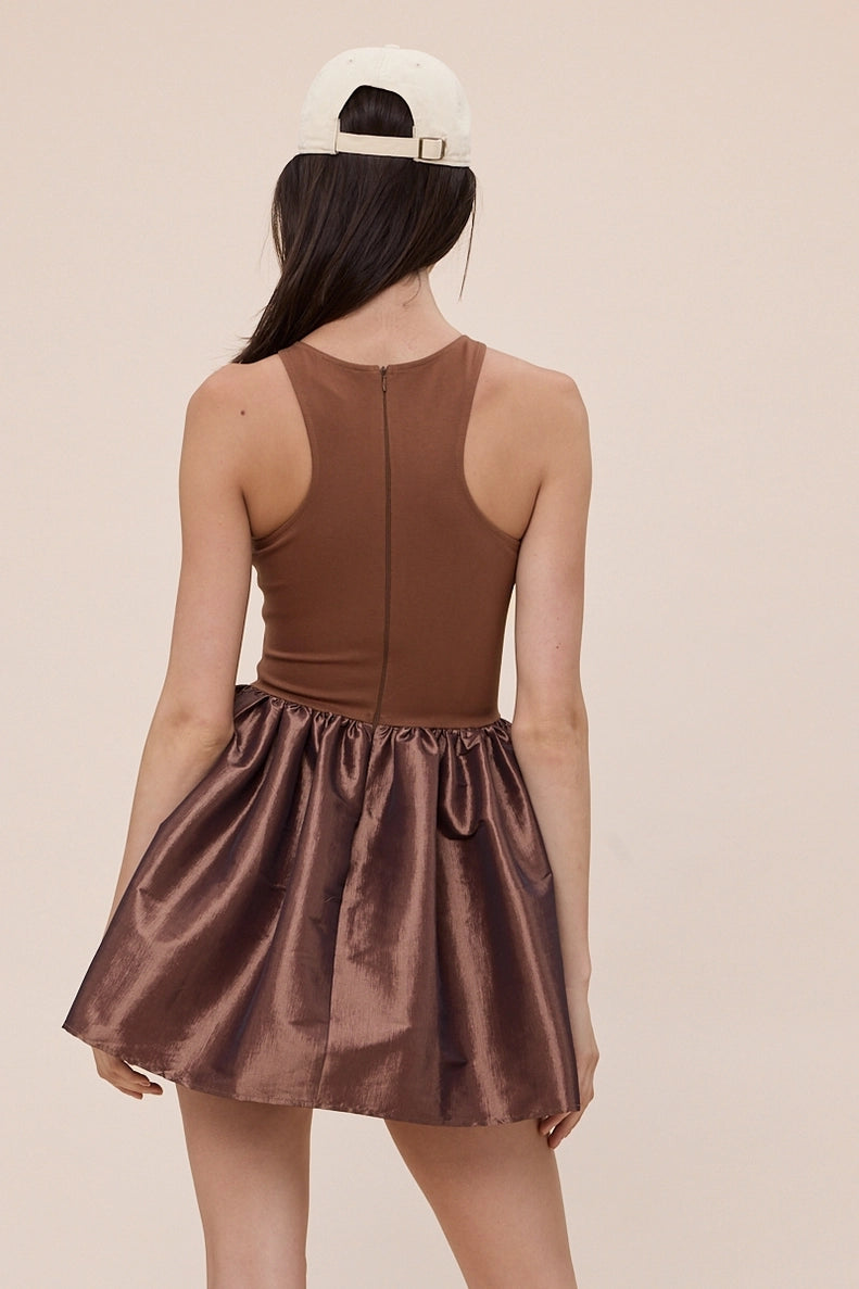 This mini dress features a fun mix of half matte and half shiny solid colors, with a sleeveless crew neck and a back zipper. Its fit-and-flare style hugs your shape, and since it runs small, sizing up will give you a comfier, carefree vibe.