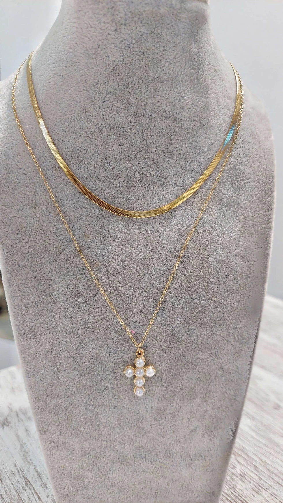 Add a touch of elegance and quirk to your outfit with this Double Necklace featuring a beautiful Pearl Cross pendant. This versatile piece can be worn alone or layered with other necklaces for a unique look. Perfect for any occasion, this necklace exudes a playful charm.