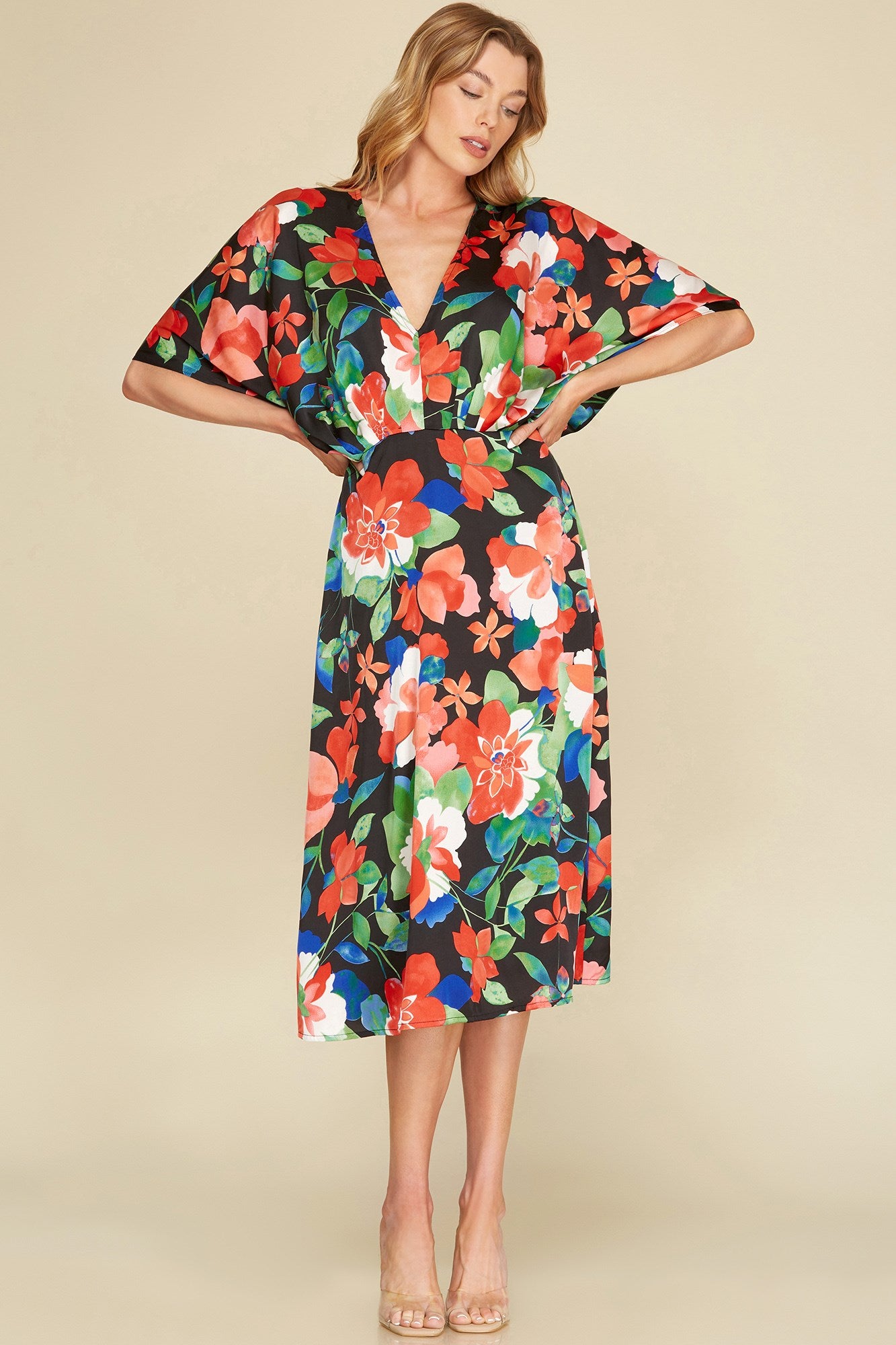 FLORAL KIMONO SLEEVE MIDI DRESS