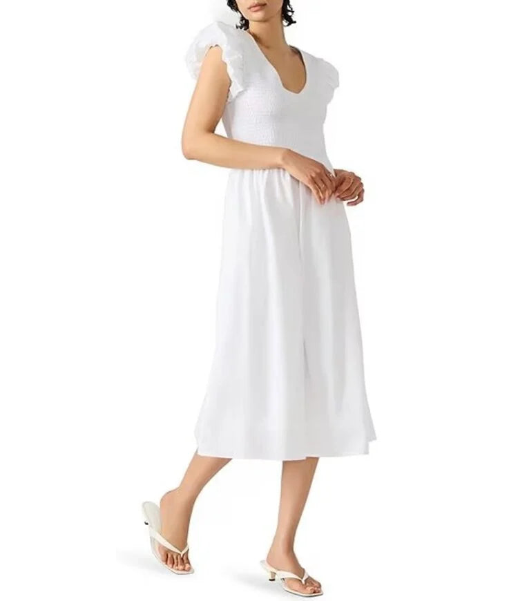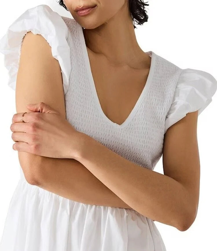Cotton poplin skirt with a rib knit bodice, V-neckline, cap sleeves, side pockets, and a pullover design that measures approximately 46" in length. Easily machine washable and tumble dry for convenience.