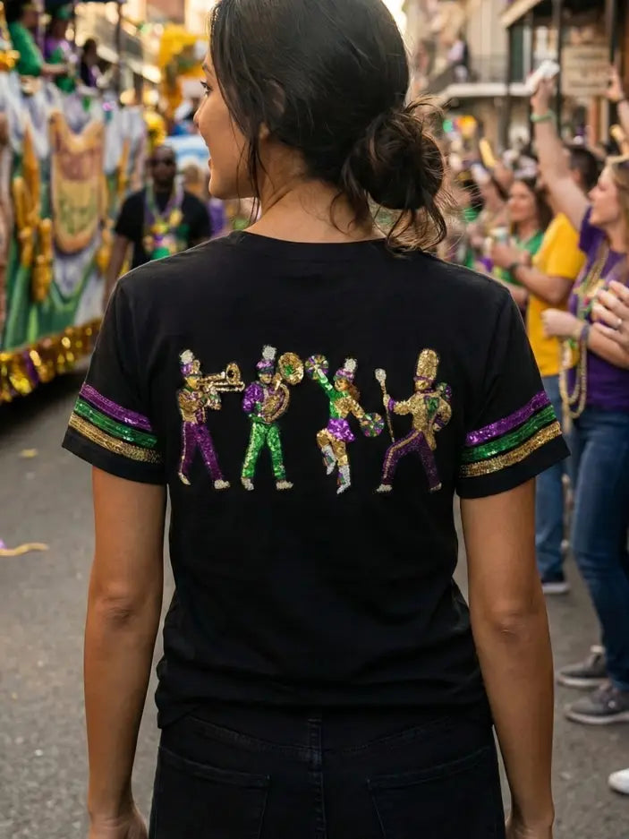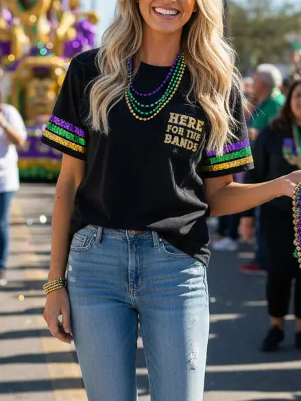 We love this Mardi Gras Sequin Embroidered "Here for the Bands" T Shirt!! There is a pocket on the front left! Absolutely gorgeous!