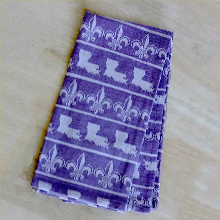 Get ready to elevate your bathroom experience with our Louisiana Fleur Jacquard Hand Towel in a vibrant purple color. This playful and quirky 20x28 towel features a unique jacquard design of the iconic Louisiana fleur, bringing a touch of fun and humor to your daily routine.
