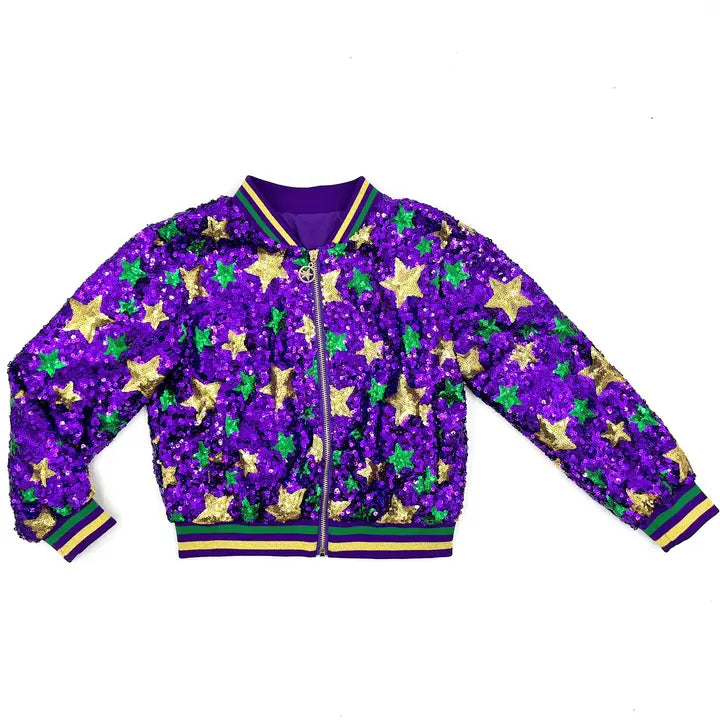Be the star of Mardi Gras in this dazzling sequin jacket! With a playful nod to the holiday's iconic colors and a bold star design, this jacket is sure to turn heads. Perfect for adding some sparkle to any celebratory outfit. Laissez les bons temps rouler!