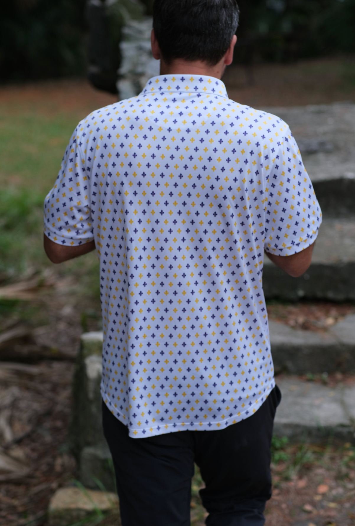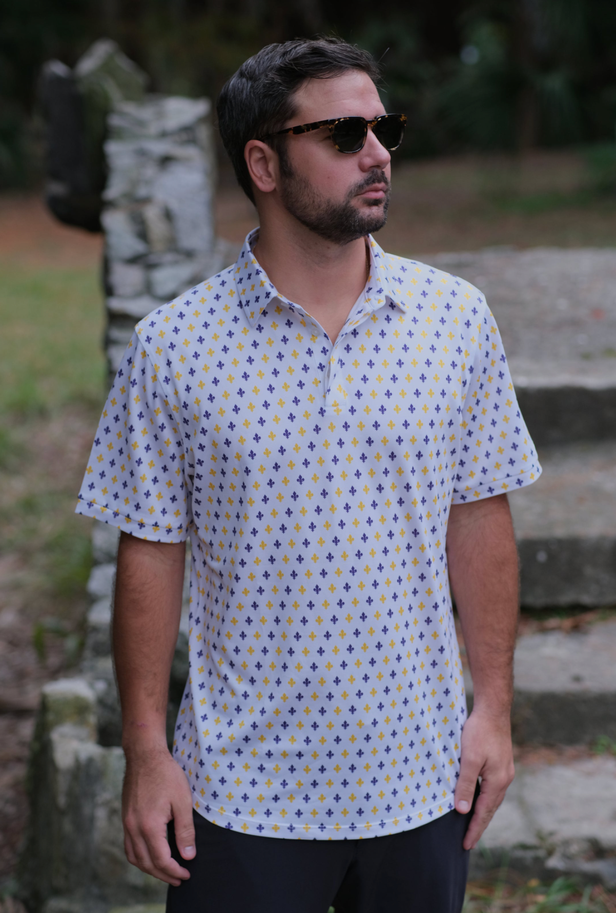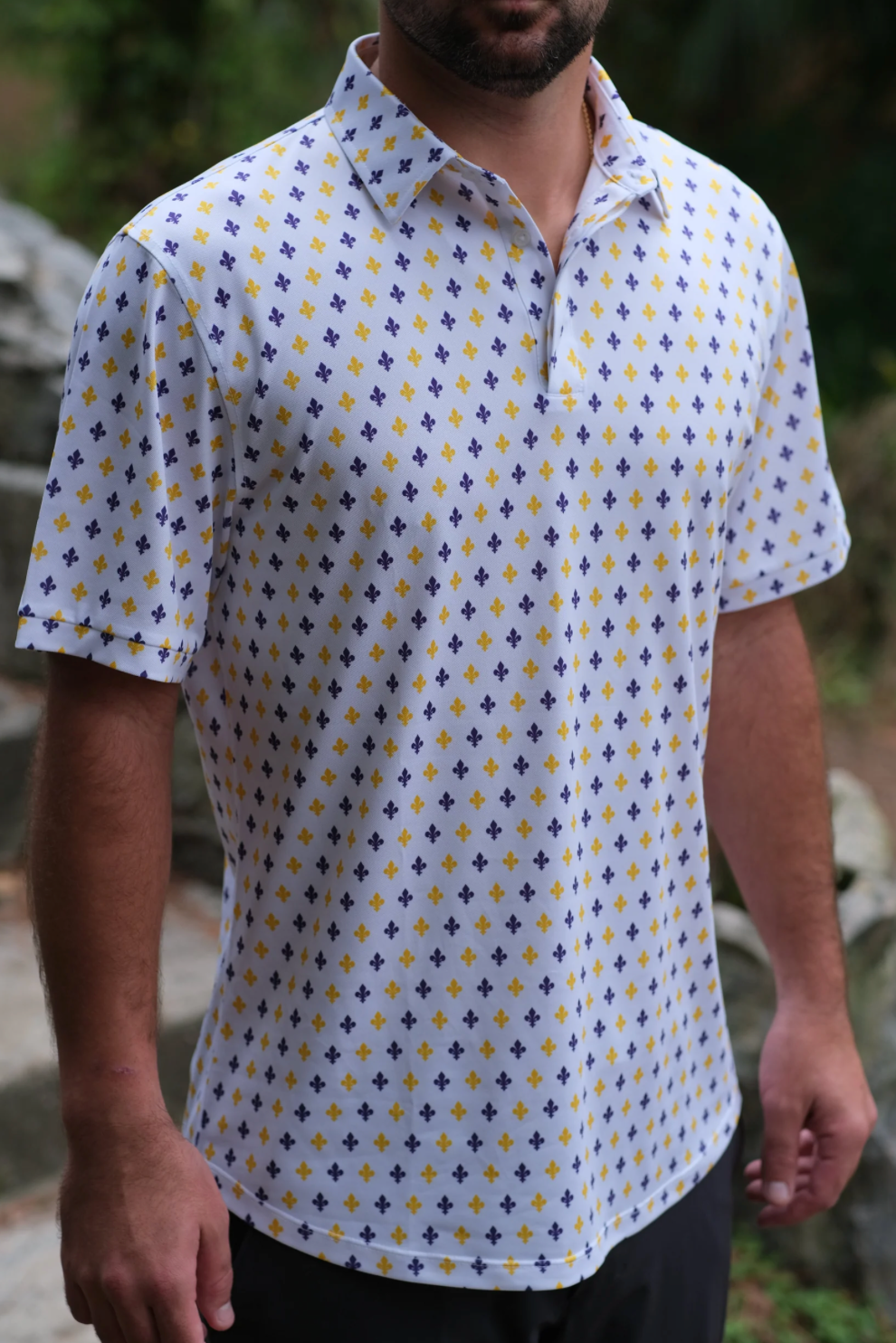 Show off your unique style with our Men's Purple & Gold Fluer-De-LIs Polo Shirt. This shirt features a playful design that will turn heads and a comfortable fit for all-day wear. Perfect for adding some fun to your wardrobe.
