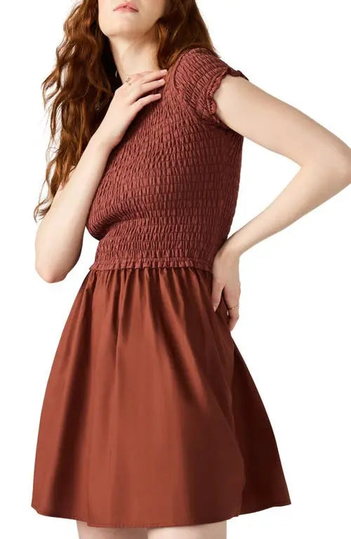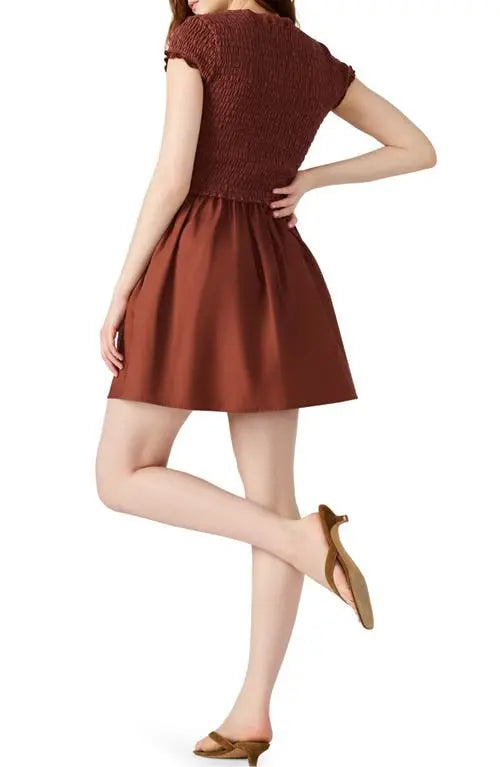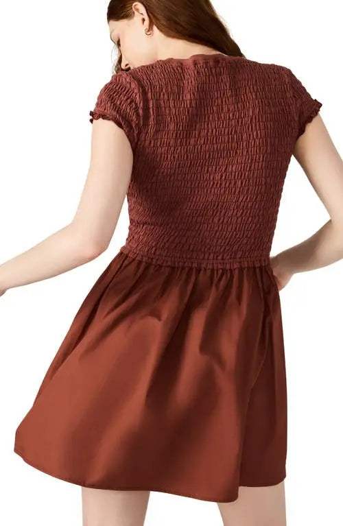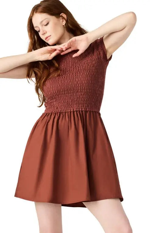 This mini length flared skirt dress from Steve Madden features a jewel neck, short sleeves, side-seam pockets, and a smocked silhouette crafted from crisp poplin in 100% cotton.
