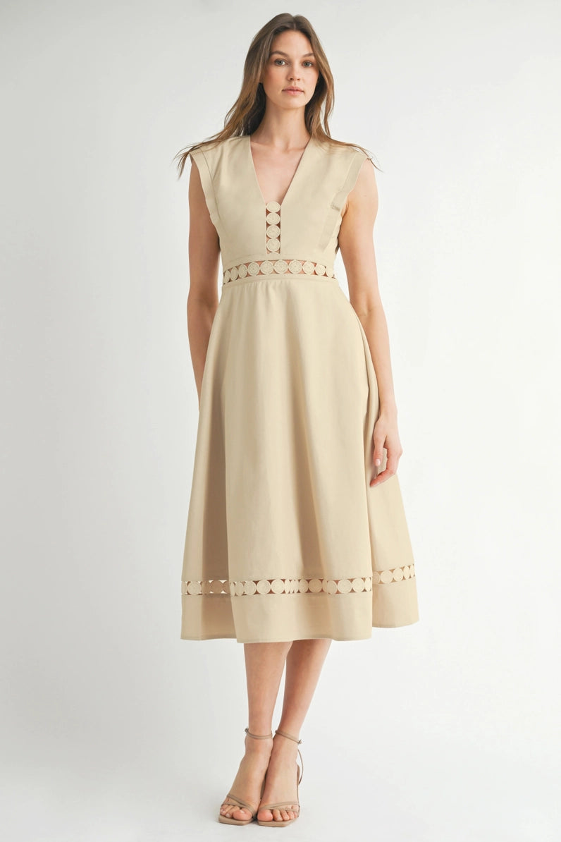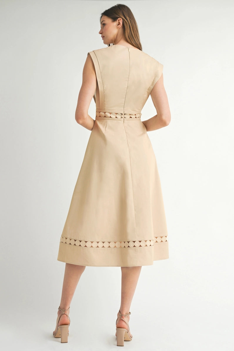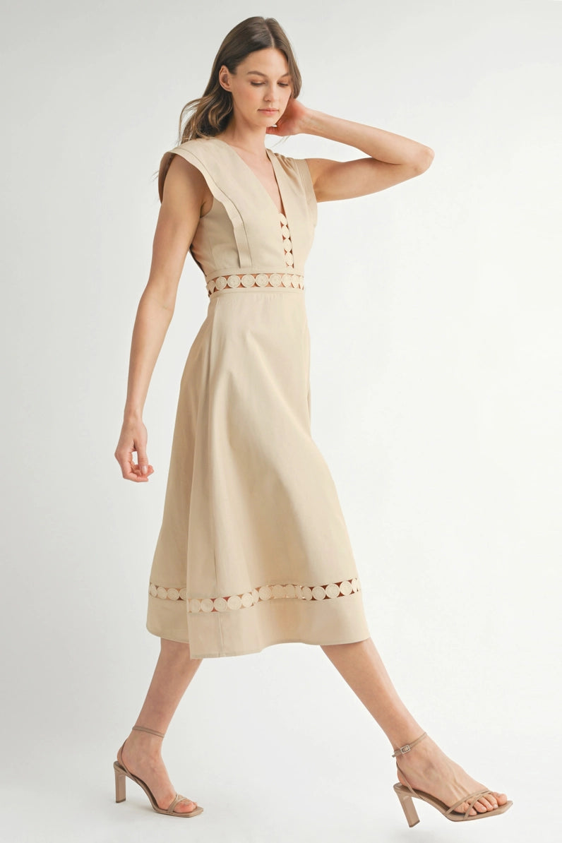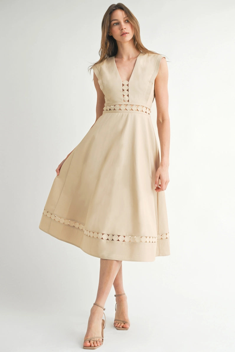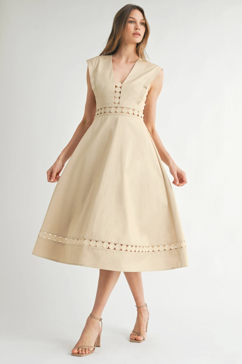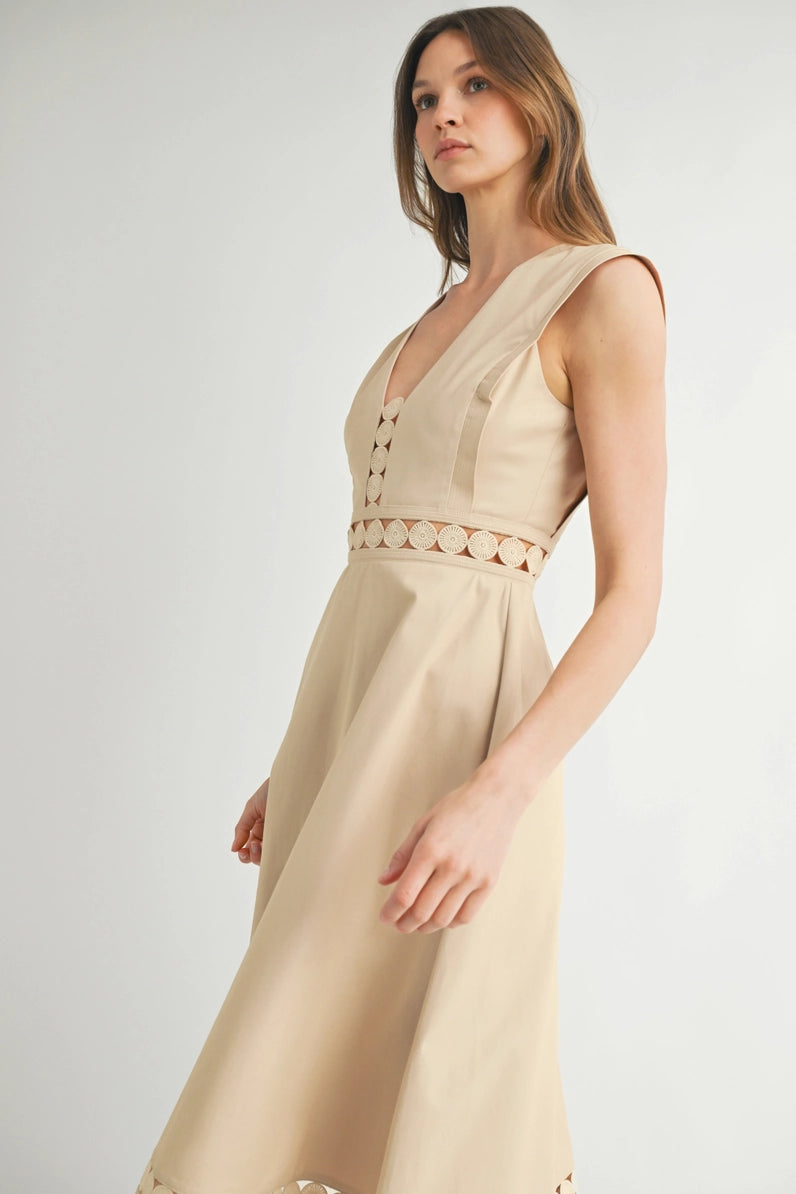 This midi dress features delicate circle crochet lace trim and a back zipper for a flattering fit. With its elegant design, it's the perfect choice for any occasion, blending sophistication with timeless style