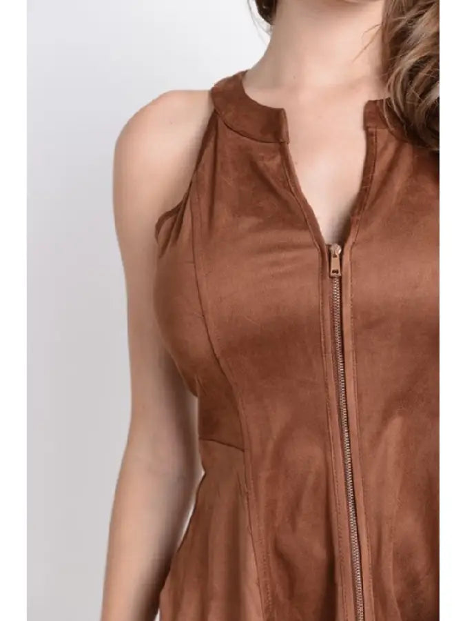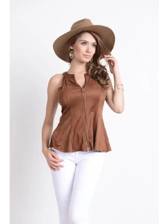 This playful sleeveless suede top features a zip-up front and a flattering V-neck, finished with a chic peplum silhouette.