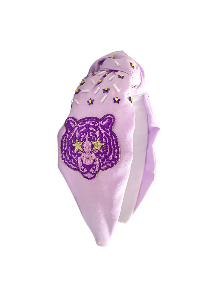 Cheer on the tigers with our best selling headband! Each headband is accented with sprinkle beads and a embroidered patch tiger.