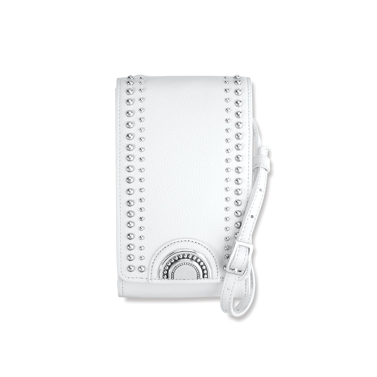 Carry your phone and essentials in this modern edgy phone organizer. Trimmed in a double row of studs and modern hardware, it's definitely a cool-girl silhouette.